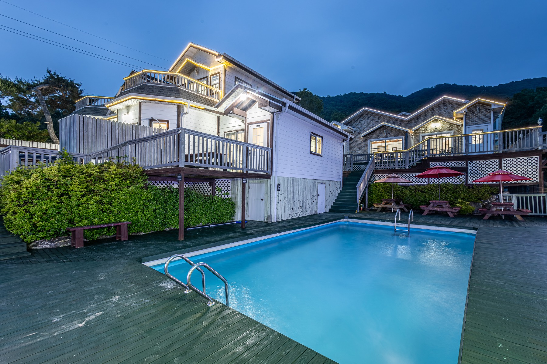 입실가능 객실: 전 객실 소형 반려동물(7kg미만):1박기준 1마리 당 20,000원 소형 반려동물(7kg이상~9.9KG):1박기준 1마리 당 30,000원 중형 반려동물(10KG~):1박기준1마리 당 50,000원 *13kg 이상 대형견 동반 불가 최대 3마리까지 입실가능 동반하는 애견이 침구류에 배변 시 10,000원 이상의 세탁비용 발생 *현장결제 [애견수영장] 2025년 운영일자 : 05월 28일 오픈 하절기 운영 / 날씨에 따라 변동될 수 있음 이용시간:입실시~19시 이용복장:수영복 및 래쉬가드