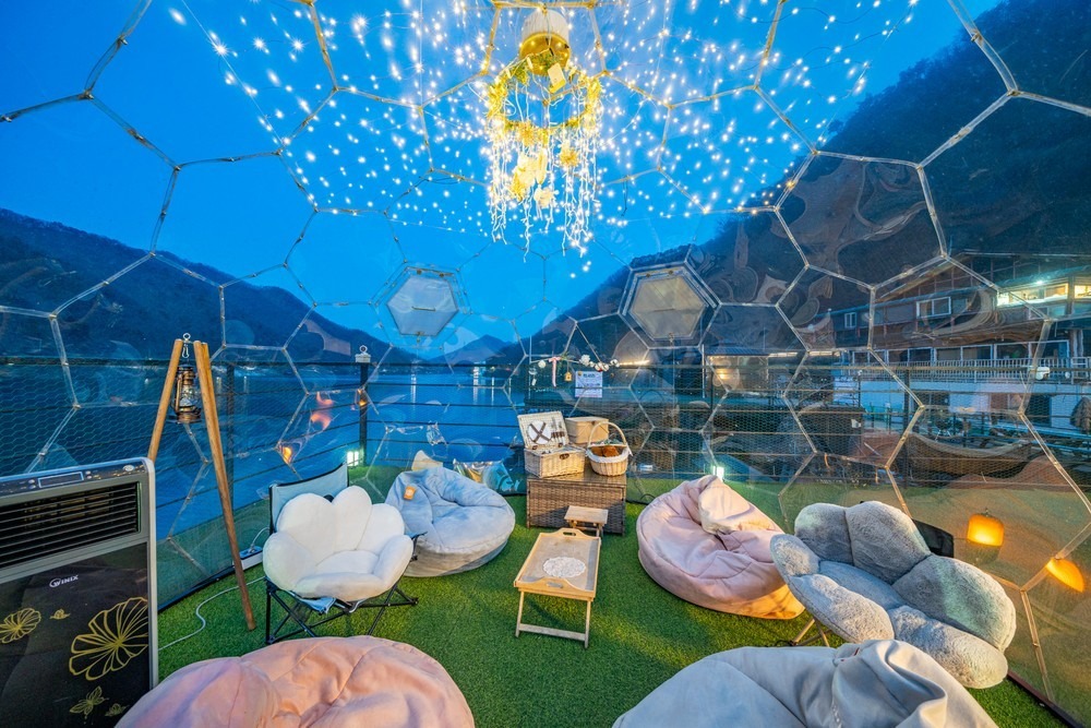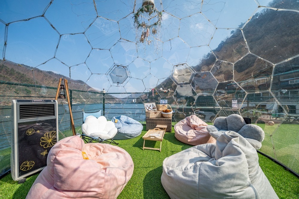 4계절 내내 산의 아름다운 색깔 조화와 맑은 공기 그리고 추운 날씨에도 따듯하게 바깥 풍경을 감상하며 반려견과 함께 휴식할 수 있는 돔이 준비되어 있습니다.
