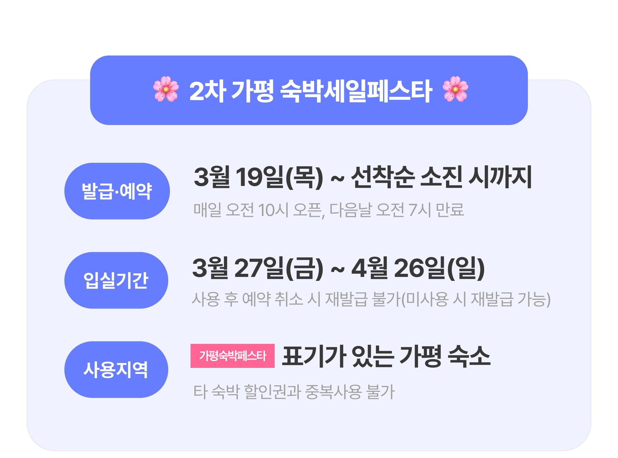 - ‘가평숙박페스타’ 표기가 있는 숙소에 한해 본 숙박 할인권 사용이 가능합니다.