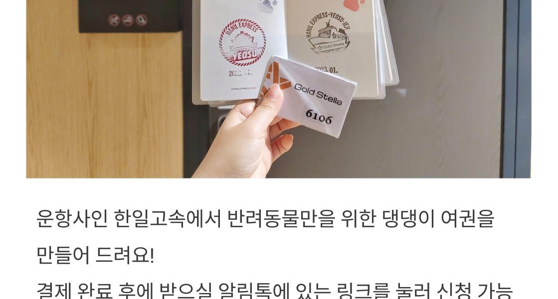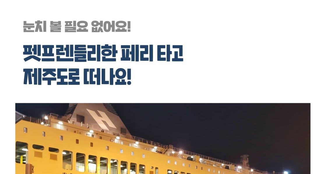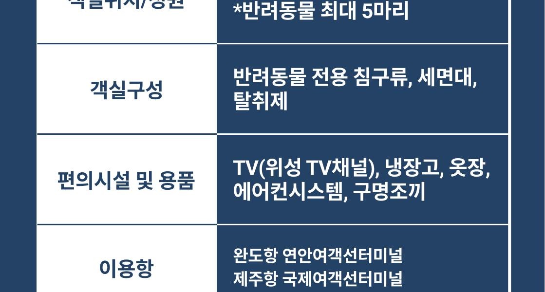 -결제 후 탑승정보 폼을 꼭 작성해 주셔야 합니다. (결제 시 알림톡으로 작성링크를 보내드립니다.) -이후 확인과정을 거쳐 확정문자를 보내드립니다 (탑승정보 작성 후, 영업일 기준 최대 약 1~2일 소요될 수 있습니다. -탑승정보 폼을 작성하지 않으실 경우 예약확정이 불가합니다. -결제 후 100% 예약확정은 아닙니다. -실시간예약 특성상 중복예약이 발생할 수 있으며, 중복예약으로 인해 전체좌석 초과 시 예약이 취소될 수 있습니다. **중복예약이란? = 고객님이 예약하신 날짜에 기존 예약이 있어 중복되는 경우를 말합니다. [🚢선박 이용 관련 ] ✔️승선절차 확인하기 https://www.hanilexpress.co.kr/expressFerry/embarkProcedure/checkinWando.do - 탑승정보 확인 후 운항사 한일고속에서 대표자 1인께 확정 알림톡을 보내드립니다. (탑승정보 작성 이후 영업일 기준 최대 약 1~2일 소요 ) - 출항 하루 전, 대표자 일행 모두에게 모바일 승선권이 발송됩니다. - 모바일 승선권/신분증을 반드시 지참하시고, 여객터미널에서 대기 후 현장 안내에 따라 승선해 주시기 바랍니다. - 차량을 승선하시는 고객의 경우, 먼저 차량 선적 후 여객터미널로 이동해 주시기 바랍니다. - 차량은 출항 1시간 반 전, 여객은 30분 전부터 승선 가능합니다. (새벽 02:30분 선박은 00시 30분부터 차량, 여객 승선 가능합니다.) - 반려동물 추가요금은 없으며, 해당 요금은 사람 수가 기준이 아닌, 4~5인실 객실 기준 요금입니다. - 펫여권 신청도 홈페이지에서 가능합니다. (출발 7일전 신청 필수 / https://www.hanilexpress.co.kr/event/progress/123) - 선박 운항 스케줄은 운항사측의 사정에 따라 달라질 수 있으므로, 결제 완료 시 받은 알림톡을 확인해 주시기 바랍니다. - 차량승선의 경우 별도 추가결제를 하셔야 하며, 에약 시 차량정보 기입을 하시면 차량승선 결제 문자를 발송해 드립니다. - 전기차 승선 시 배터리 50%미만이어야 하며, 배터리 사고 이력이 없어야 합니다. (해당되지 않을 경우 선적이 거부될 수 있으며, 환불이 불가할 수 있습니다.) [ 🐶 반려동물 탑승 안내 ] 자세한 반려동물 탑승안내는 다음 링크를 눌러 확인해 주세요:) https://www.hanilexpress.co.kr/event/specialServiceDtl.do - 보호자 1인당 최대 1견 동반 가능합니다 - 반려동물은 전용케이지에 넣어야 승선이 가능합니다. (유모차,슬링백X/하드케이지 또는 소프트케이지만 가능) - 펫룸, 펫존 제외 선내 모든 공간은 케이지에서 꺼낼 수 없습니다. - 대형견의 경우 케이지에 넣고 들고 이동이 불가능한 경우 목줄, 입마개 후 걸어서 이동 가능하나, 케이지는 지참하셔야 합니다. - 안전사고가 발생하지 않도록 반려견을 케어해 주시기 바랍니다. - 보호자의 부주의로 인해 현장에서 발생하는 돌발상황 및 안전사고는 보호자의 책임입니다. *터미널 안내 [완도 -> 제주] 완도항 연안여객선터미널 이용선박: 실버클라우드, 골드스텔라 차량선적부두: 3부두 주소: 전라남도 완도군 완도읍 장보고대로 339 [제주->완도] 제주항 국제 여객선터미널 이용선박 : 실버클라우드, 골드스텔라 차량선적부두 : 6부두 (실버클라우드), 9부두(골드스텔라) 주소: 제주특별자치도 제주시 임항로 191