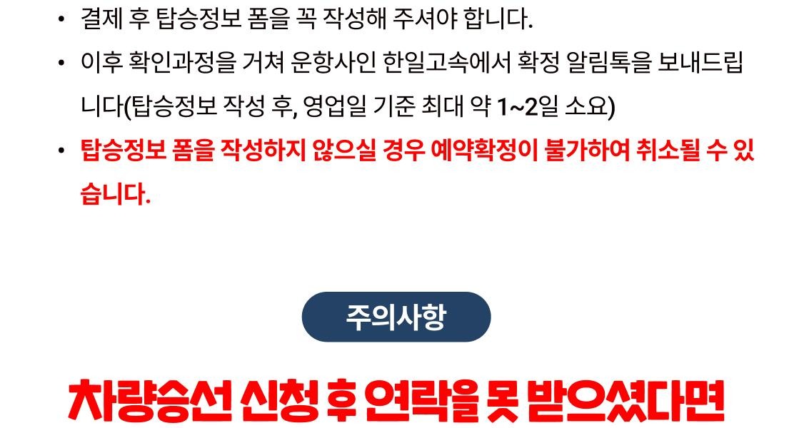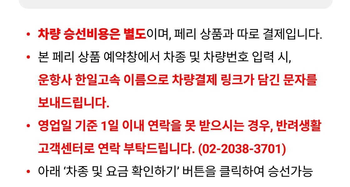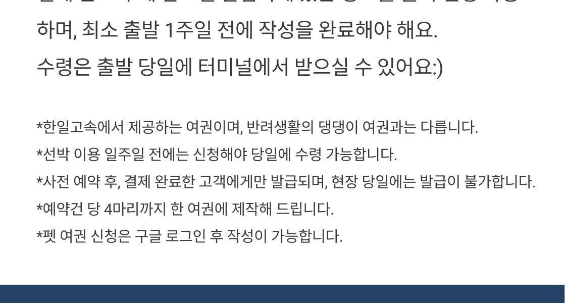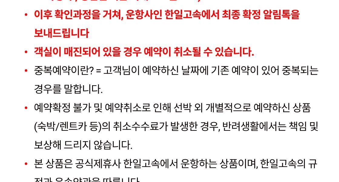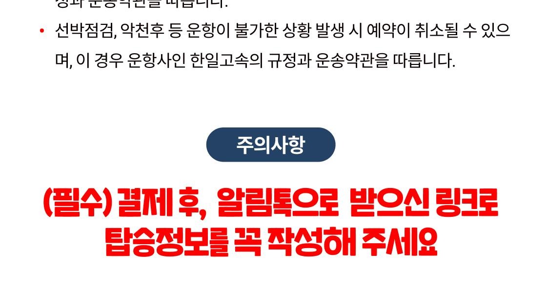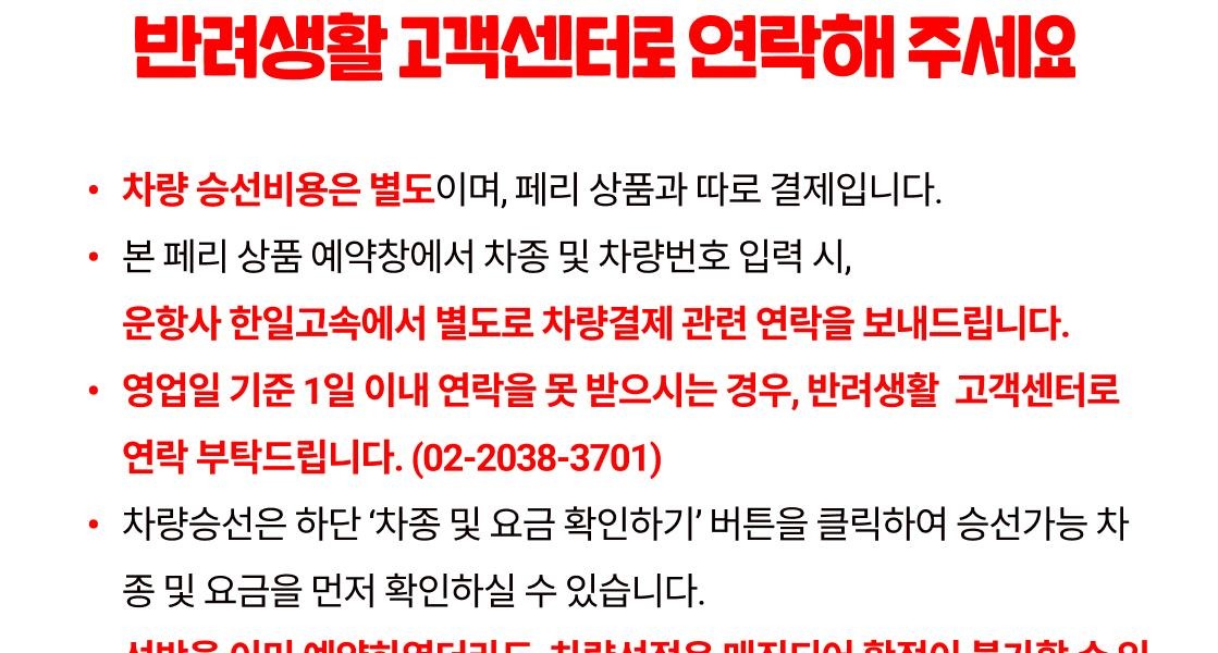 -결제 후 100% 예약확정은 아닙니다. -실시간예약 특성상 중복예약이 발생할 수 있으며, 중복예약으로 인해 전체좌석 초과 시 예약이 취소될 수 있습니다. -정확한 실시간 객실 재고 확인은 운항사인 한일고속 공식홈페이지에서 확인 가능하십니다. 다만, 반려생활에서는 실시간 재고현황이 연동되지 않는 점 양해 부탁드립니다. https://www.hanilexpress.co.kr/ -본 상품은 공식제휴사 한일고속에서 운항하는 상품이며, 운항/이용 관련해서는 한일고속의 규정과 운송약관을 따릅니다. -일반 성인 요금 기준이며, 결제시 경로/소인/장애 할인 등 각종 할인혜택은 적용되지 않습니다. - 선박의 경우 기상악화/점검으로 인해 운항이 불가할 수 있습니다. (결항시 취소문자 발송 후, 유선 상담 안내) - 승선시 여객의 신분확인이 강화되어 신분증 미지참시 승선이 거부되오니 유의하여 주시기 바랍니다. - 발권마감시간 후에는 예매 고객을 포함한 모든 고객의 승선권 발권이 불가능하며, 승선권이 없는 고객은 승선하실 수 없습니다. - 승선마감시간 후에는 발권한 고객을 포함한 모든 고객의 승선이 제한되므로, 반드시 승선마감 시간 전에 승선하시기 바랍니다. - 연안여객 운송 약관 제30조에 의해 명시된 위험 물품(화약류, 휘발유, 고압가스, 페인트 등)은 운송을 거절 할 수 있습니다. - 유류할증료 변동으로 인해, 요금이 변경될 수 있습니다. - 예약확정 불가 및 예약취소로 인해 선박 외 개별적으로 예약하신 상품(숙박/렌트카 등)의 취소수수료가 발생한 경우, 반려생활에서는 책임 및 보상해 드리지 않습니다. - 선박점검, 악천후 등 운항이 불가한 상황 발생 시 예약이 취소될 수 있으며, 이 경우 운항사인 한일고속의 규정과 운송약관을 따릅니다. - 일반 성인 요금 기준이며, 결제시 경로/소인/장애 할인 등 각종 할인혜택은 적용되지 않습니다. -10% 할인 요금은 유류할증료+터미널이용료를 포함한 금액이며, 유류할증료는 1,500원 터미널이용료 1,500원 기준으로 책정된 요금입니다. 운항사측 유류할증료는 매월 달라질 수 있으며, 이에 따라 시기상 실제 할인율에 차이가 있을 수 있습니다. - 차량승선의 경우 별도 추가결제를 하셔야 하며, 에약 시 차량정보 기입을 하시면 차량승선 결제 문자를 발송해 드립니다. - 전기차 승선 시 배터리 50%미만이어야 하며, 배터리 사고 이력이 없어야 합니다. (해당되지 않을 경우 선적이 거부될 수 있으며, 환불이 불가할 수 있습니다.)