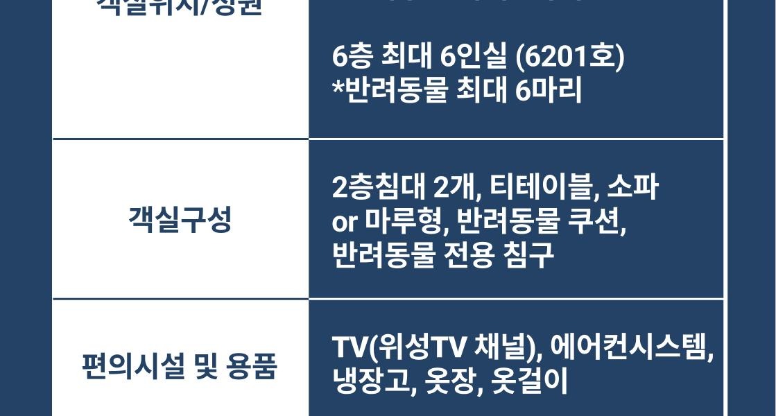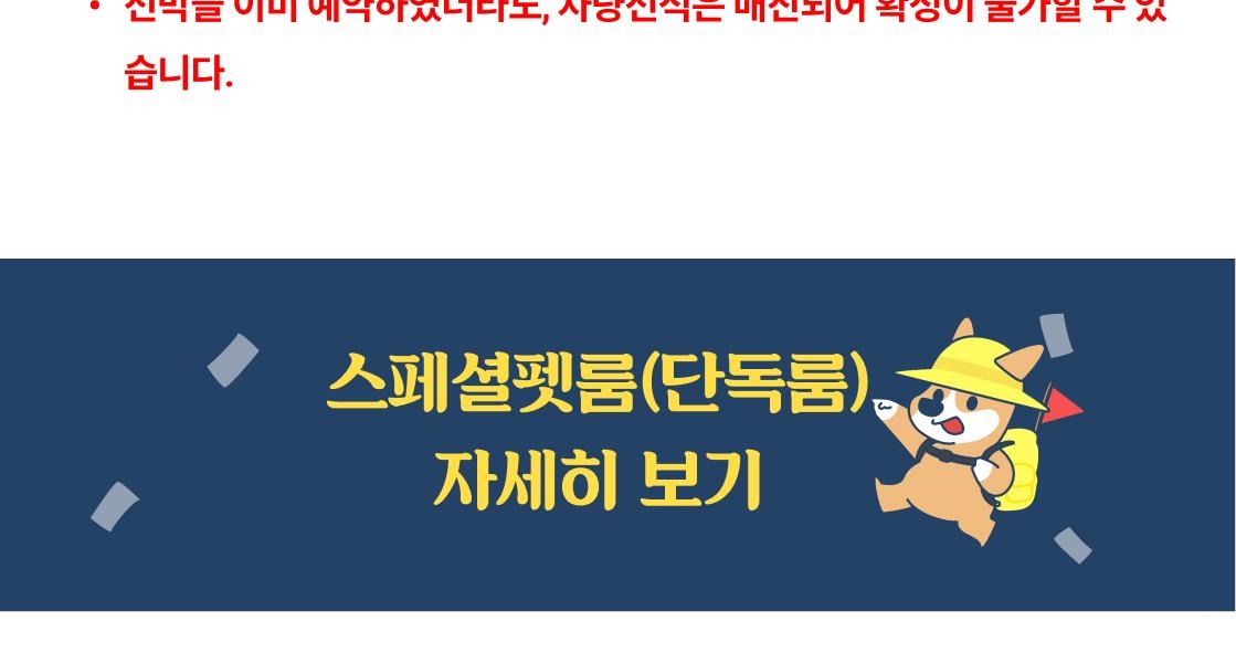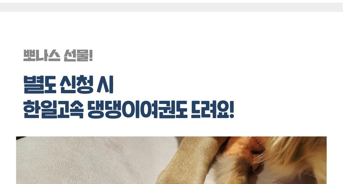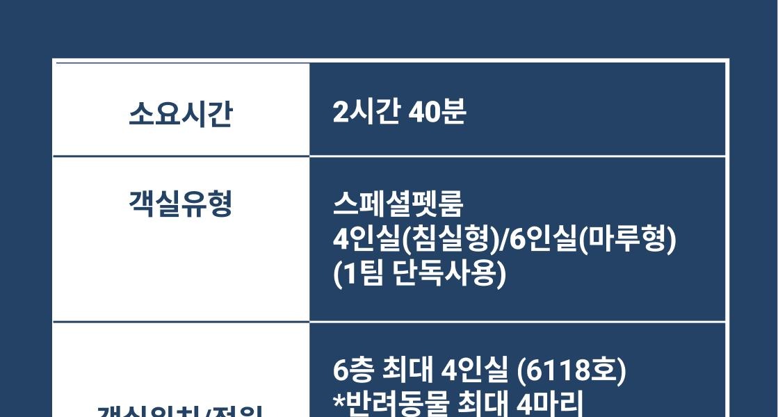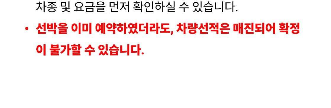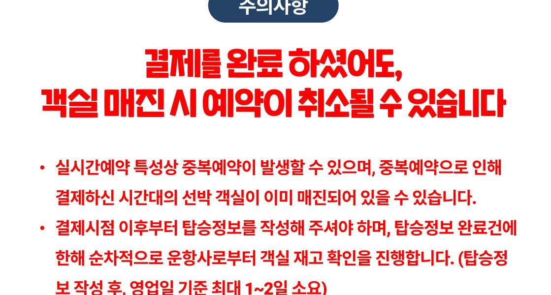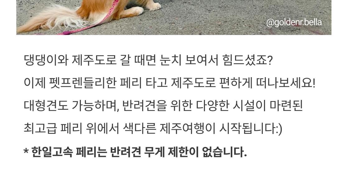 -결제 후 100% 예약확정은 아닙니다. -실시간예약 특성상 중복예약이 발생할 수 있으며, 중복예약으로 인해 전체좌석 초과 시 예약이 취소될 수 있습니다. -정확한 실시간 객실 재고 확인은 운항사인 한일고속 공식홈페이지에서 확인 가능하십니다. 다만, 반려생활에서는 실시간 재고현황이 연동되지 않는 점 양해 부탁드립니다. https://www.hanilexpress.co.kr/ -본 상품은 공식제휴사 한일고속에서 운항하는 상품이며, 운항/이용 관련해서는 한일고속의 규정과 운송약관을 따릅니다. -일반 성인 요금 기준이며, 결제시 경로/소인/장애 할인 등 각종 할인혜택은 적용되지 않습니다. - 선박의 경우 기상악화/점검으로 인해 운항이 불가할 수 있습니다. (결항시 취소문자 발송 후, 유선 상담 안내) - 승선시 여객의 신분확인이 강화되어 신분증 미지참시 승선이 거부되오니 유의하여 주시기 바랍니다. - 발권마감시간 후에는 예매 고객을 포함한 모든 고객의 승선권 발권이 불가능하며, 승선권이 없는 고객은 승선하실 수 없습니다. - 승선마감시간 후에는 발권한 고객을 포함한 모든 고객의 승선이 제한되므로, 반드시 승선마감 시간 전에 승선하시기 바랍니다. - 연안여객 운송 약관 제30조에 의해 명시된 위험 물품(화약류, 휘발유, 고압가스, 페인트 등)은 운송을 거절 할 수 있습니다. - 유류할증료 변동으로 인해, 요금이 변경될 수 있습니다. - 예약확정 불가 및 예약취소로 인해 선박 외 개별적으로 예약하신 상품(숙박/렌트카 등)의 취소수수료가 발생한 경우, 반려생활에서는 책임 및 보상해 드리지 않습니다. - 선박점검, 악천후 등 운항이 불가한 상황 발생 시 예약이 취소될 수 있으며, 이 경우 운항사인 한일고속의 규정과 운송약관을 따릅니다. - 일반 성인 요금 기준이며, 결제시 경로/소인/장애 할인 등 각종 할인혜택은 적용되지 않습니다. -10% 할인 요금은 유류할증료+터미널이용료를 포함한 금액이며, 유류할증료는 1,500원 터미널이용료 1,500원 기준으로 책정된 요금입니다. 운항사측 유류할증료는 매월 달라질 수 있으며, 이에 따라 시기상 실제 할인율에 차이가 있을 수 있습니다. - 차량승선의 경우 별도 추가결제를 하셔야 하며, 에약 시 차량정보 기입을 하시면 차량승선 결제 문자를 발송해 드립니다. - 전기차 승선 시 배터리 50%미만이어야 하며, 배터리 사고 이력이 없어야 합니다. (해당되지 않을 경우 선적이 거부될 수 있으며, 환불이 불가할 수 있습니다.)