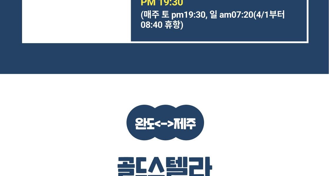[완도 -> 제주] 완도항 연안여객선터미널 이용선박: 실버클라우드, 골드스텔라 차량선적부두: 3부두 주소: 전라남도 완도군 완도읍 장보고대로 339 [제주->완도] 제주항 국제 여객선터미널 이용선박 : 실버클라우드, 골드스텔라 차량선적부두 : 6부두 (실버클라우드), 9부두(골드스텔라) 주소: 제주특별자치도 제주시 임항로 191