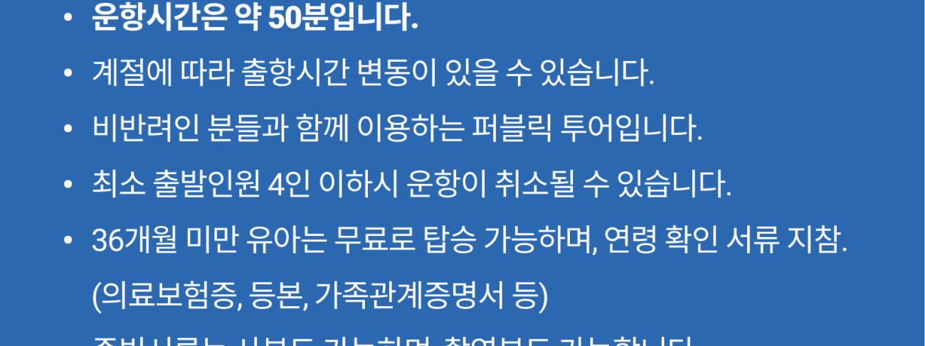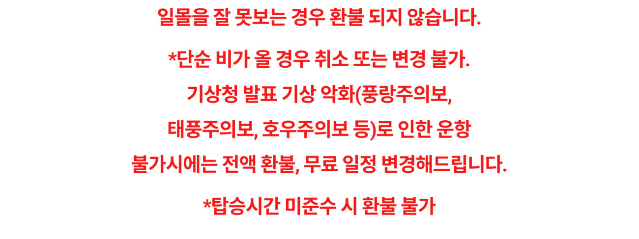 -단순 비가 올 경우 취소 또는 변경 불가. 기상청 발표 기상 악화(풍랑주의보, 태풍주의보, 호우주의보 등)로 인한 운항 불가시에는 전액 환불, 무료 일정 변경해드립니다.