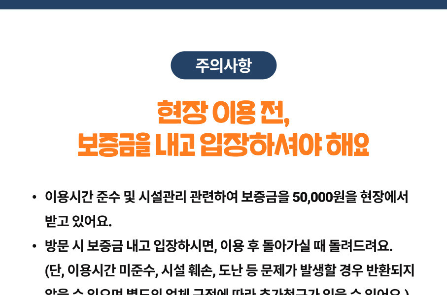 - 주변에 배달 가능한 곳이 없습니다. 음식물 모두 미리 챙겨와 주시기 바랍니다.