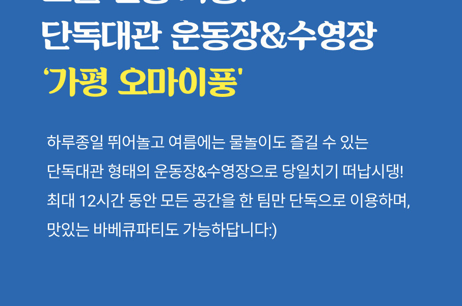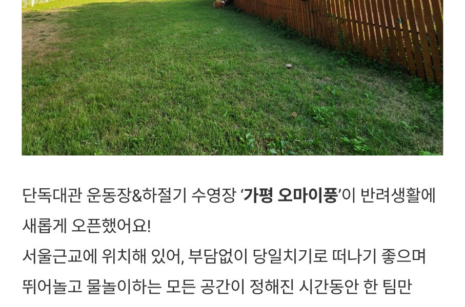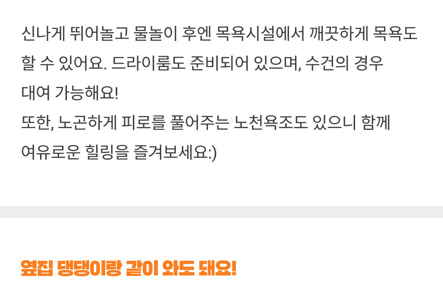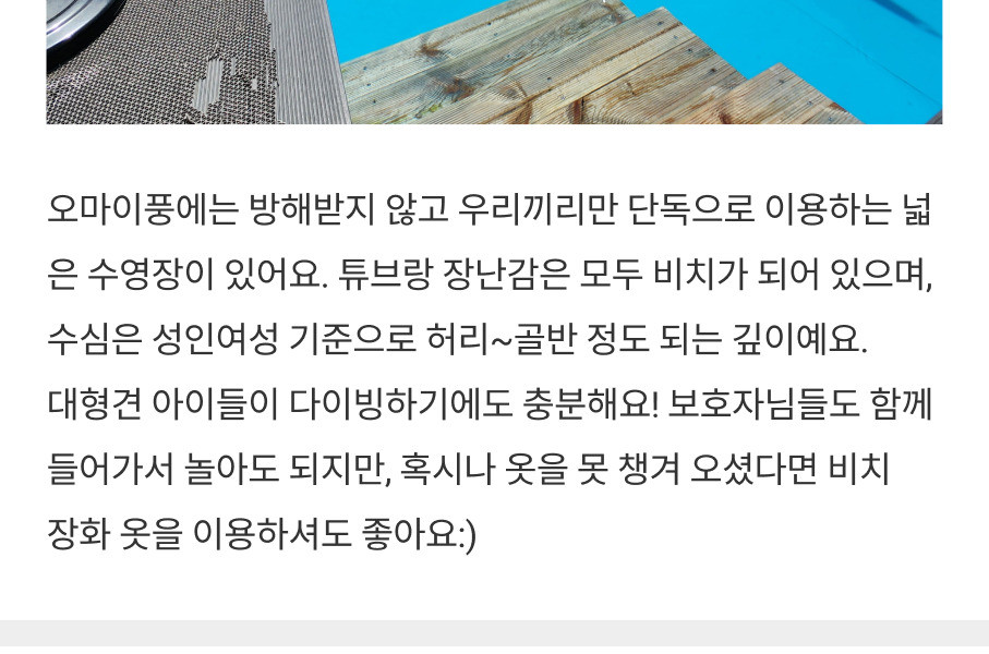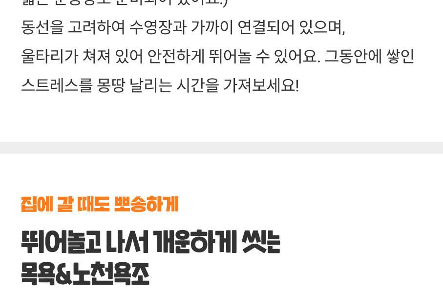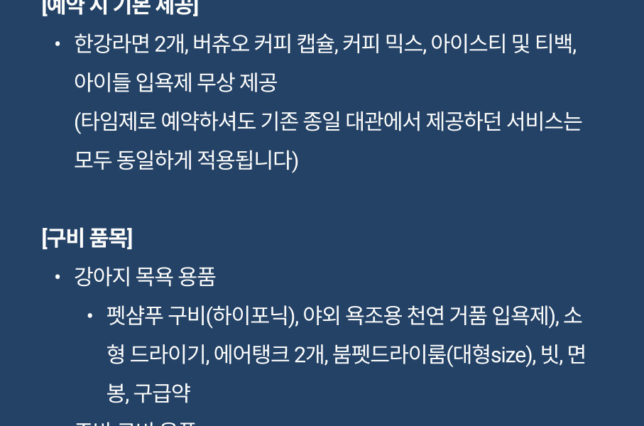 - 강아지수영장, 목욕시설, 야외욕조, 운동장은 모두 반려견을 우선시 해서 만든 공간입니다.(보호자분들 샤워 가능)