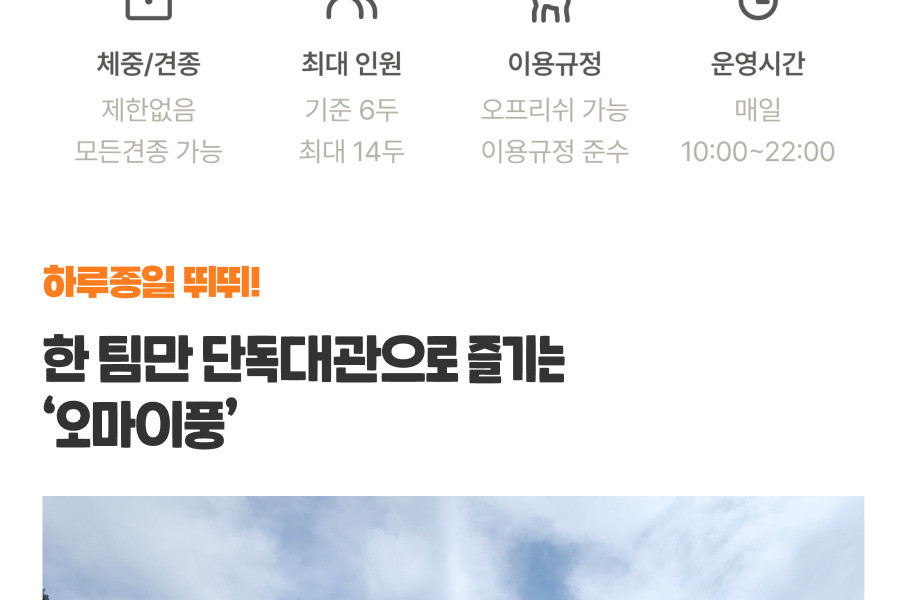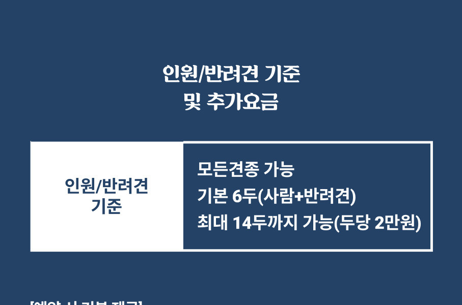 - 기본 6두이며 인원 및 강아지 추가 가능합니다.(총합 최대 14두) (보호자 최대 6인까지 가능,40kg 넘는 아이들의 경우 별도로 문의주세요)