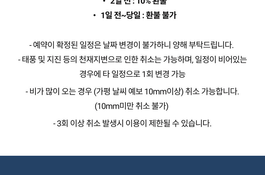(태풍 및 지진 등의 천재지변으로 인한 취소는 가능하며, 일정이 비어있는 경우에 타 일정으로 1회 변경 가능)