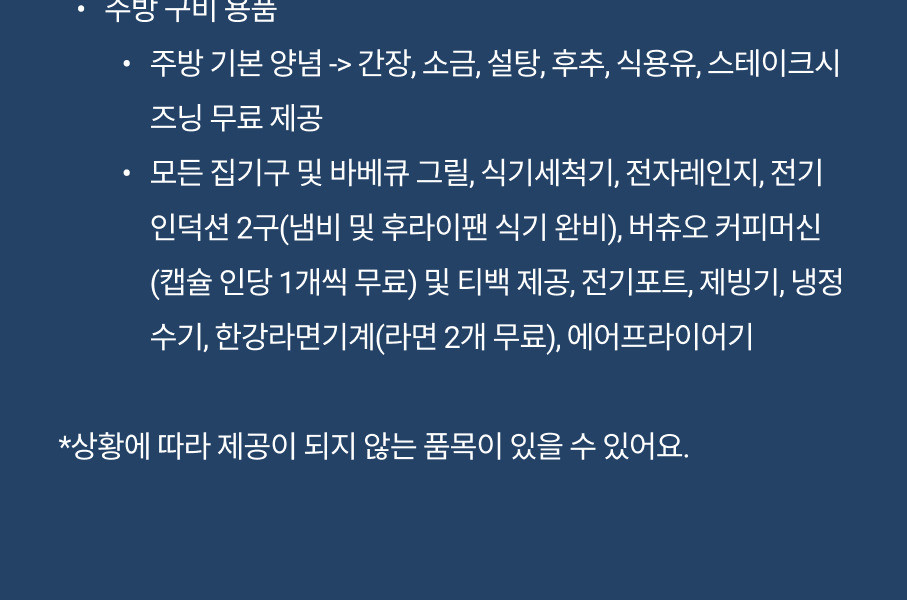 모든 집기구 및 바베큐 그릴, 식기세척기, 전자레인지, 전기 인덕션 2구(냄비 및 후라이팬 식기 완비), 버츄오 커피머신(캡슐 인당 1개씩 무료) 및 티백 제공, 전기포트, 제빙기, 냉정수기, 한강라면기계(라면 2개 무료), 에어프라이어기