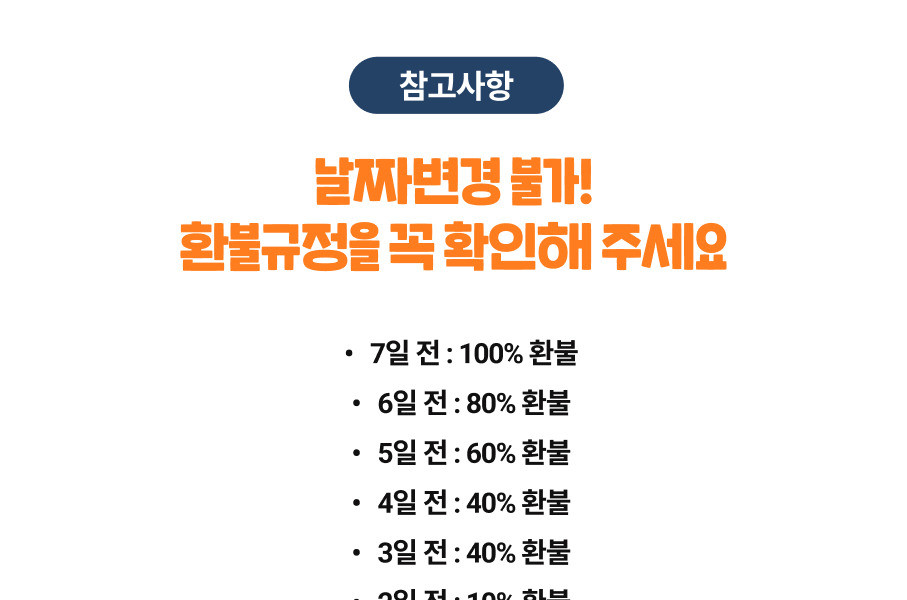 * 7일 전 환불 100%, 6일 전 80%, 5일 전 60%, 4일 전 40%, 2일 전 10%, 1일 전, 당일엔 환불 불가합니다.