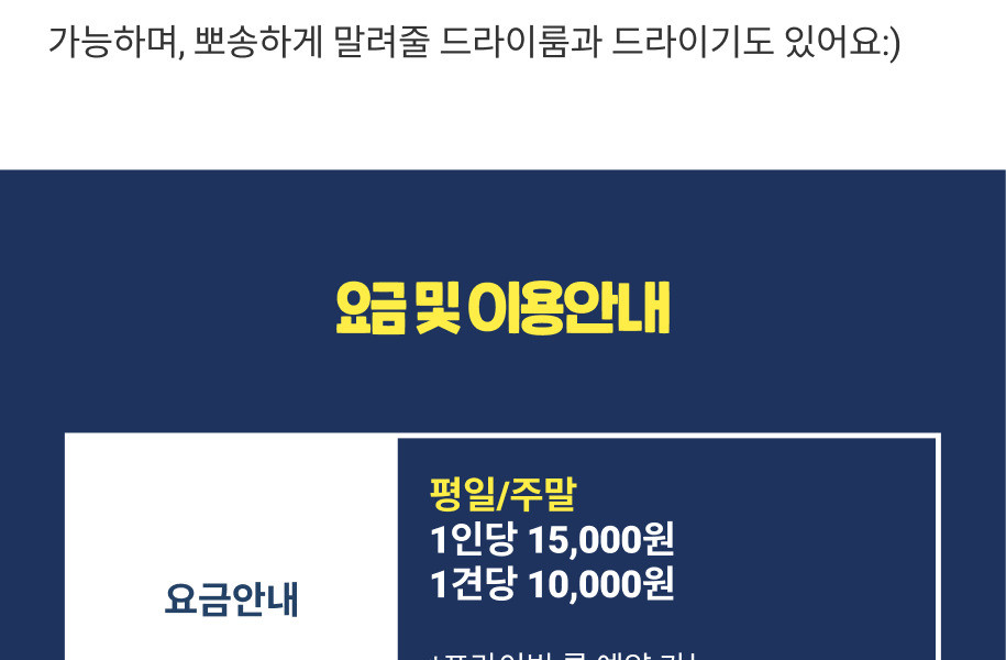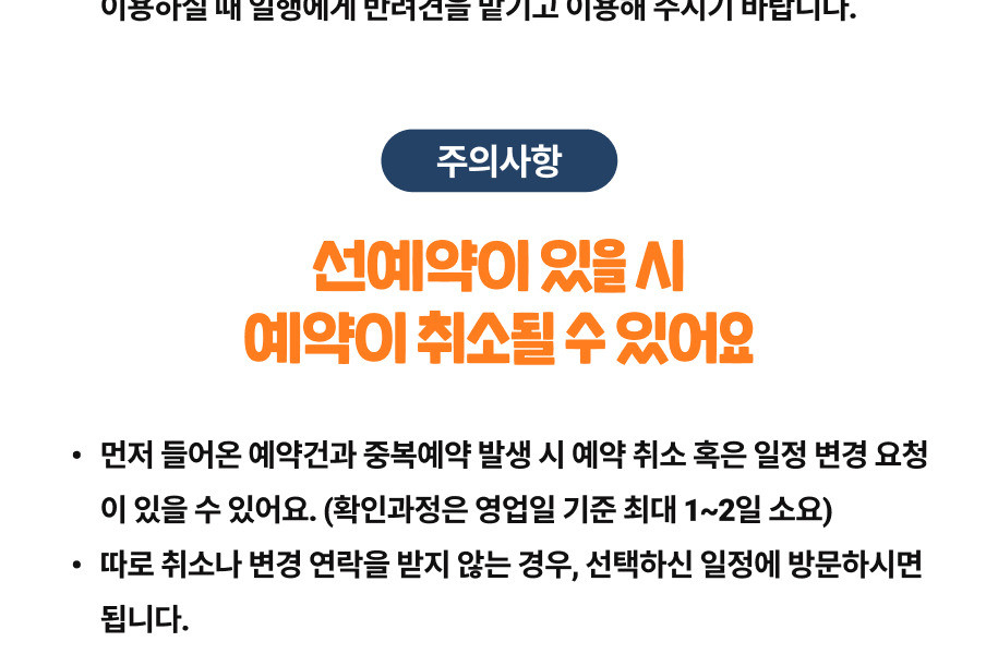 -먼저 들어온 예약건과 중복예약 발생 시 예약 취소 혹은 일정 변경 요청이 있을 수 있습니다. (확인과정은 영업일 기준 최대 1~2일 소요)