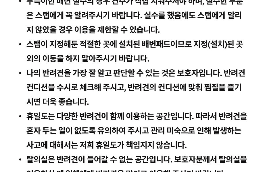 -배변 실수 시부득이한 배변 실수의 경우 견주가 직접 치워주셔야 하며, 실수한 부분은 스탭에게 꼭 알려주시기 바랍니다. 실수를 했음에도 스탭에게 알리지 않았을 경우 이용을 제한할 수 있습니다.