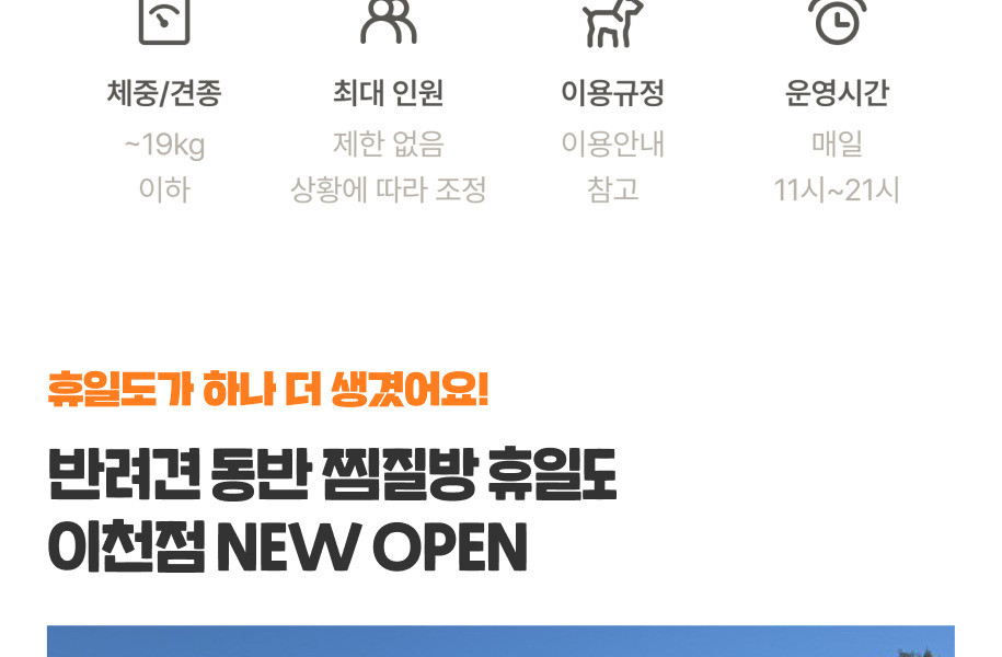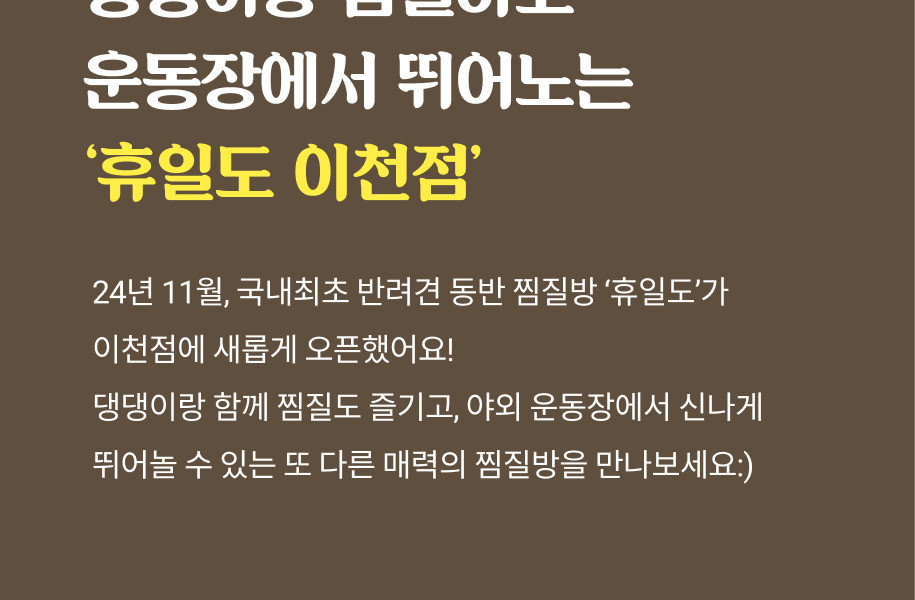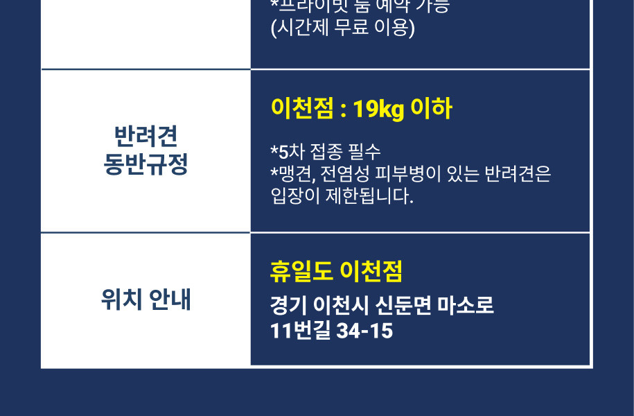 -휴일도는 다양한 반려견이 함께 이용하는 공간입니다. 따라서 반려견을 혼자 두는 일이 없도록 유의하여 주시고 관리 미숙으로 인해 발생하는 사고에 대해서는 저희 휴일도가 책임지지 않습니다.