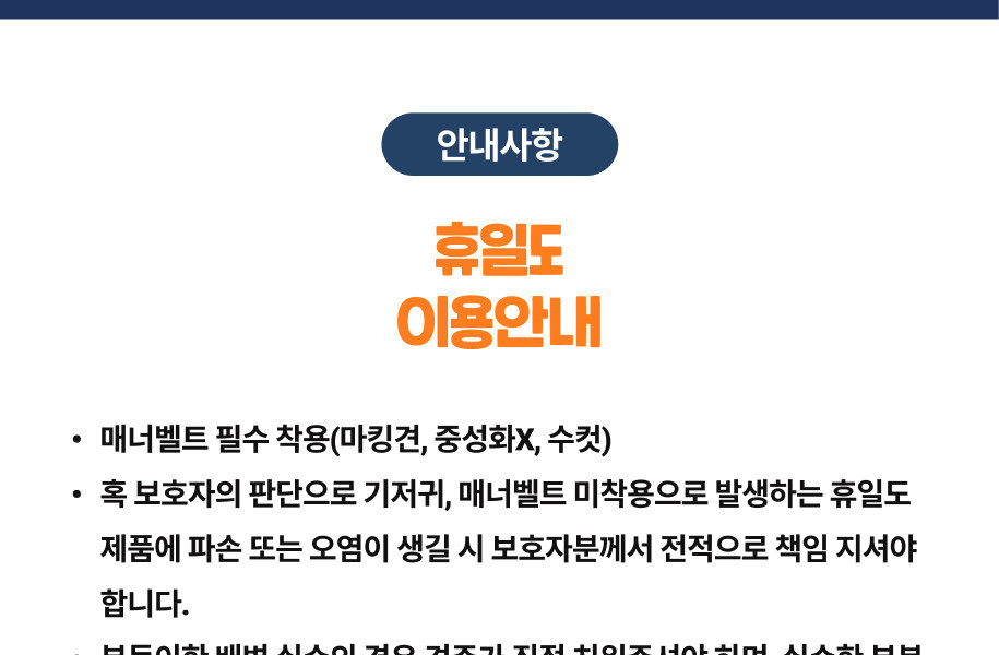 -혹 보호자의 판단으로 기저귀, 매너벨트 미착용으로 발생하는 휴일도 제품에 파손 또는 오염이 생길 시 보호자분께서 전적으로 책임 지셔야 합니다.