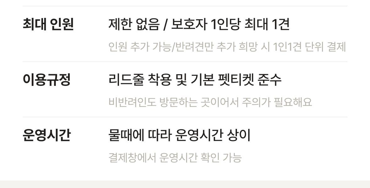 - 1 보호자당 최대 1견으로 제한되며, 인원 혹은 반려견 추가를 원할 시 1인1견 단위로 추가하셔야 해요