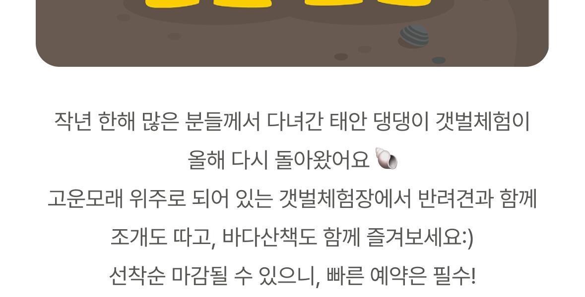 - 갯벌체험장 내 자갈, 조개 껍데기를 주의해 주세요. 반려견 아이들이 다치지 않도록 조심히 이동 부탁드려요.