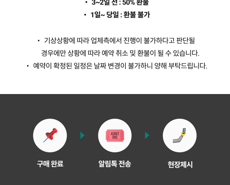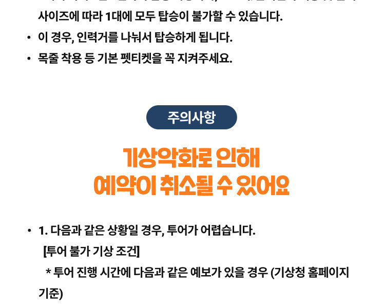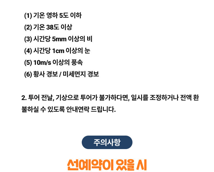 -투어 전날, 기상으로 투어가 불가하다면, 일시를 조정하거나 전액 환불하실 수 있도록 안내연락 드립니다.