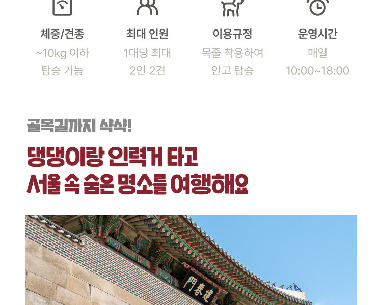 -인력거 1대 당 150kg까지 가능합니다. 성인 2명이 탑승 가능한 넓이입니다. 10kg이하 반려견 최대 2견까지 무료동반 탑승 가능합니다.