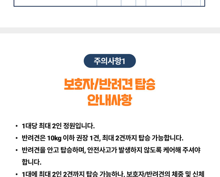 - 1대에 최대 2인 2견까지 탑승 가능하나, 보호자/반려견의 체중 및 신체사이즈에 따라 1대에 모두 탑승이 불가할 수 있습니다.