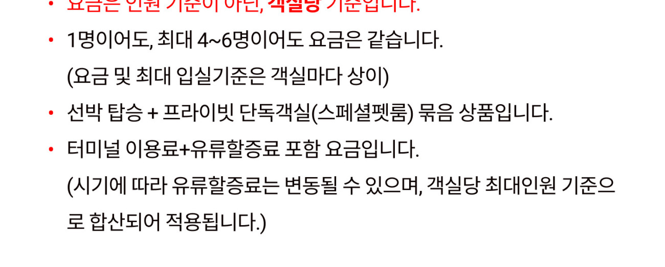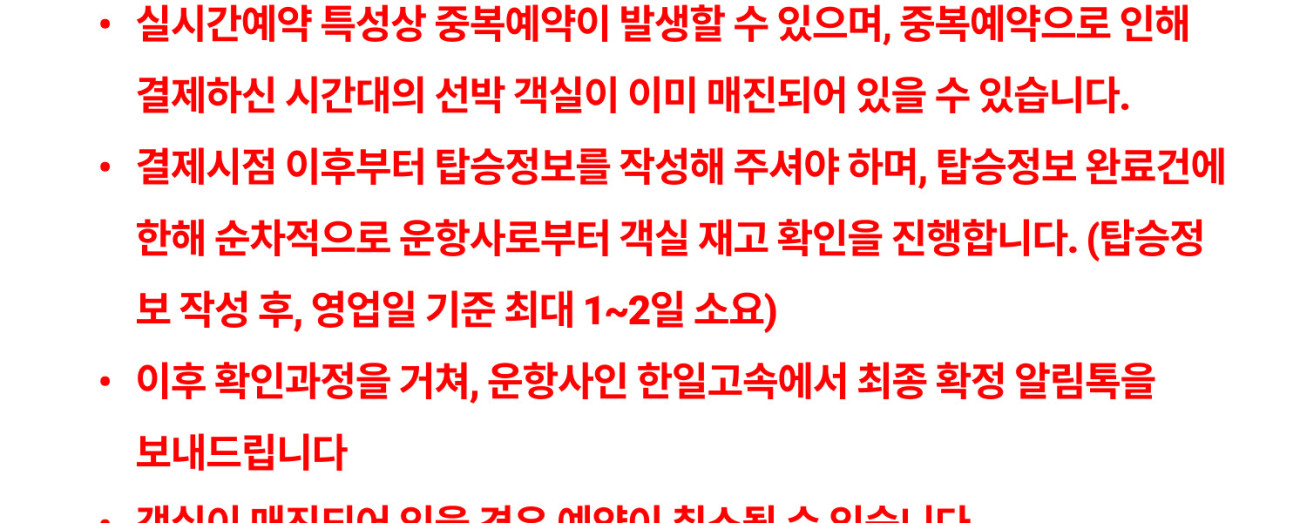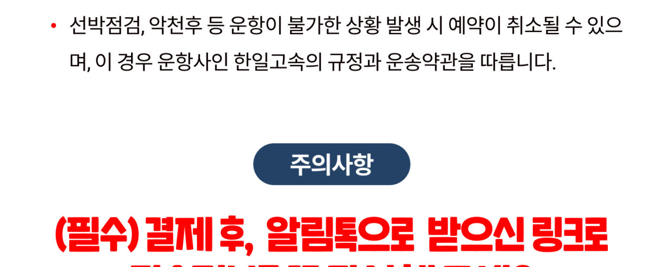 - 선박 운항 스케줄은 운항사측의 사정에 따라 달라질 수 있으므로, 결제 완료 시 받은 알림톡을 확인해 주시기 바랍니다.