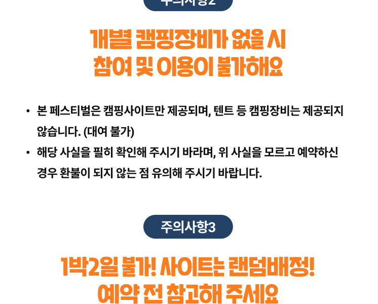 - 본 페스티벌은 캠핑사이트만 제공되며, 텐트 등 캠핑장비는 제공되지 않습니다. (대여 불가)
