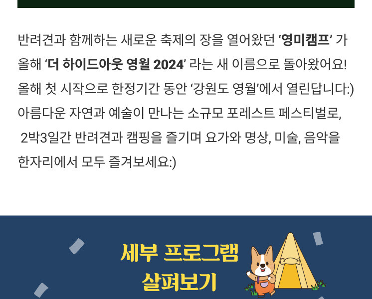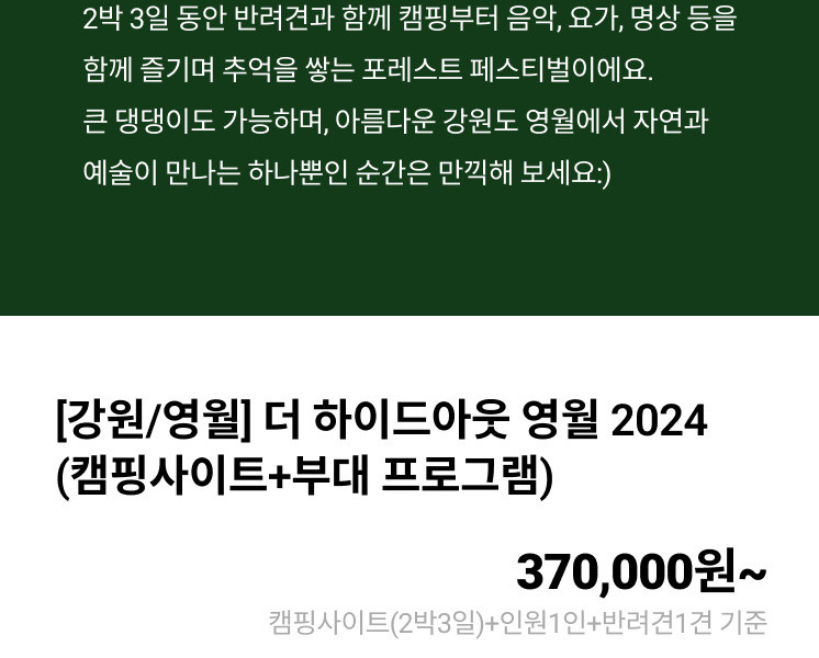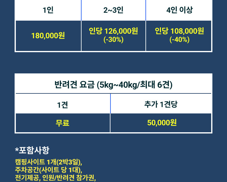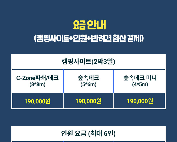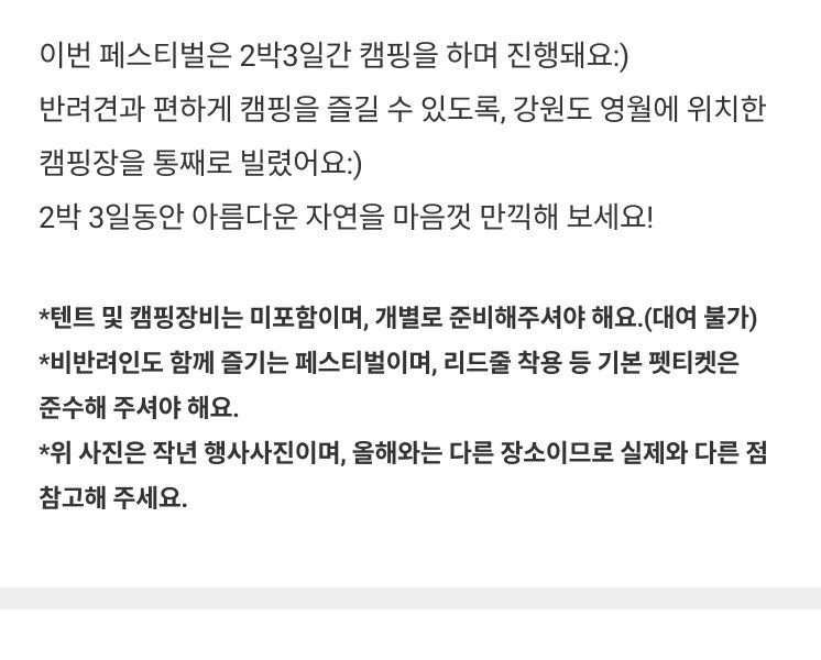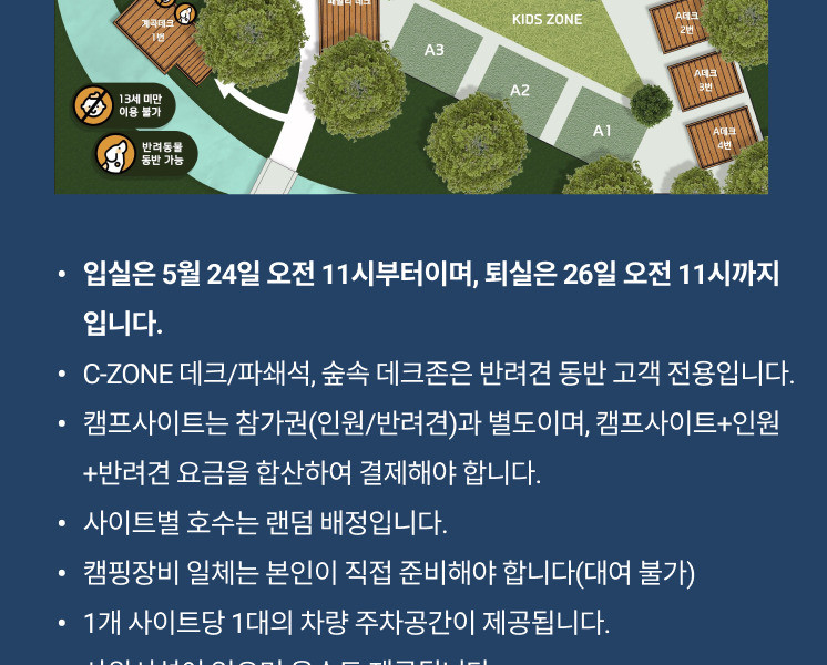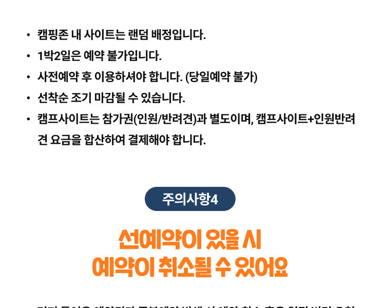 - 캠프사이트는 참가권(인원/반려견)과 별도이며, 캠프사이트+인원반려견 요금을 합산하여 결제해야 합니다.
