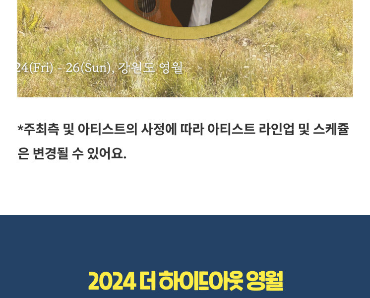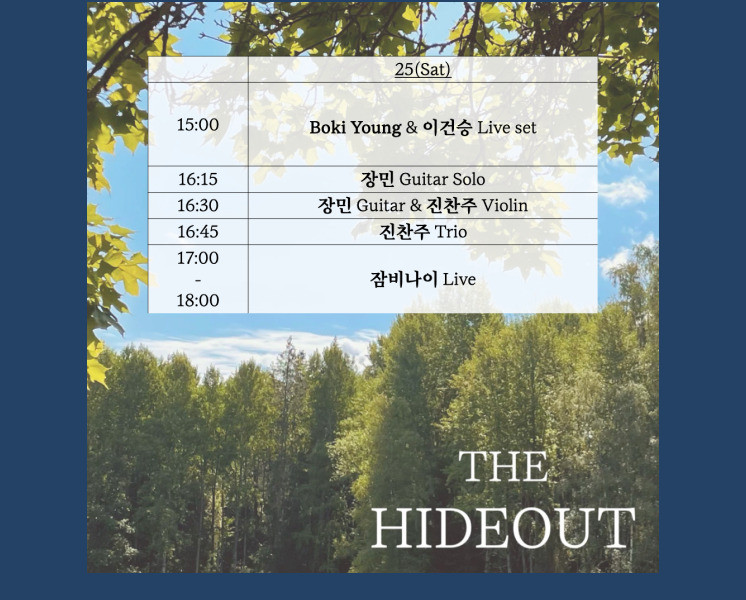 - 페스티벌 기간 동안 공식 사진 및 영상 촬영이 진행됩니다. 추후 더 하이드아웃 웹사이트 및 공식 채널 업데이트, 자료집 제작 등에 사용되며, 관객분들의 모습이 노출될 수 있는 점 미리 양해 부탁드립니다.