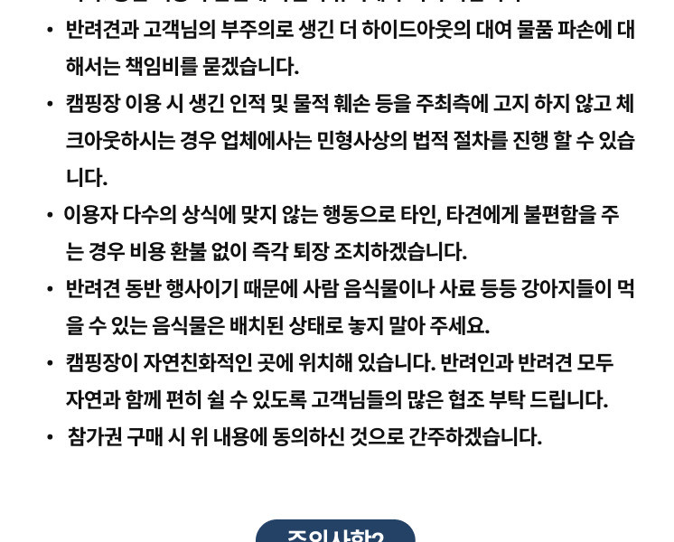 - 반려견과 고객님의 부주의로 생긴 더 하이드아웃의 대여 물품 파손에 대해서는 책임비를 묻겠습니다.
