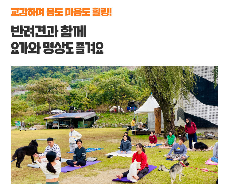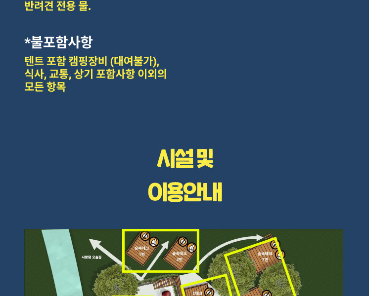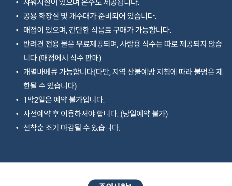 - 캠핑장이 자연친화적인 곳에 위치해 있습니다. 반려인과 반려견 모두 자연과 함께 편히 쉴 수 있도록 고객님들의 많은 협조 부탁 드립니다.
